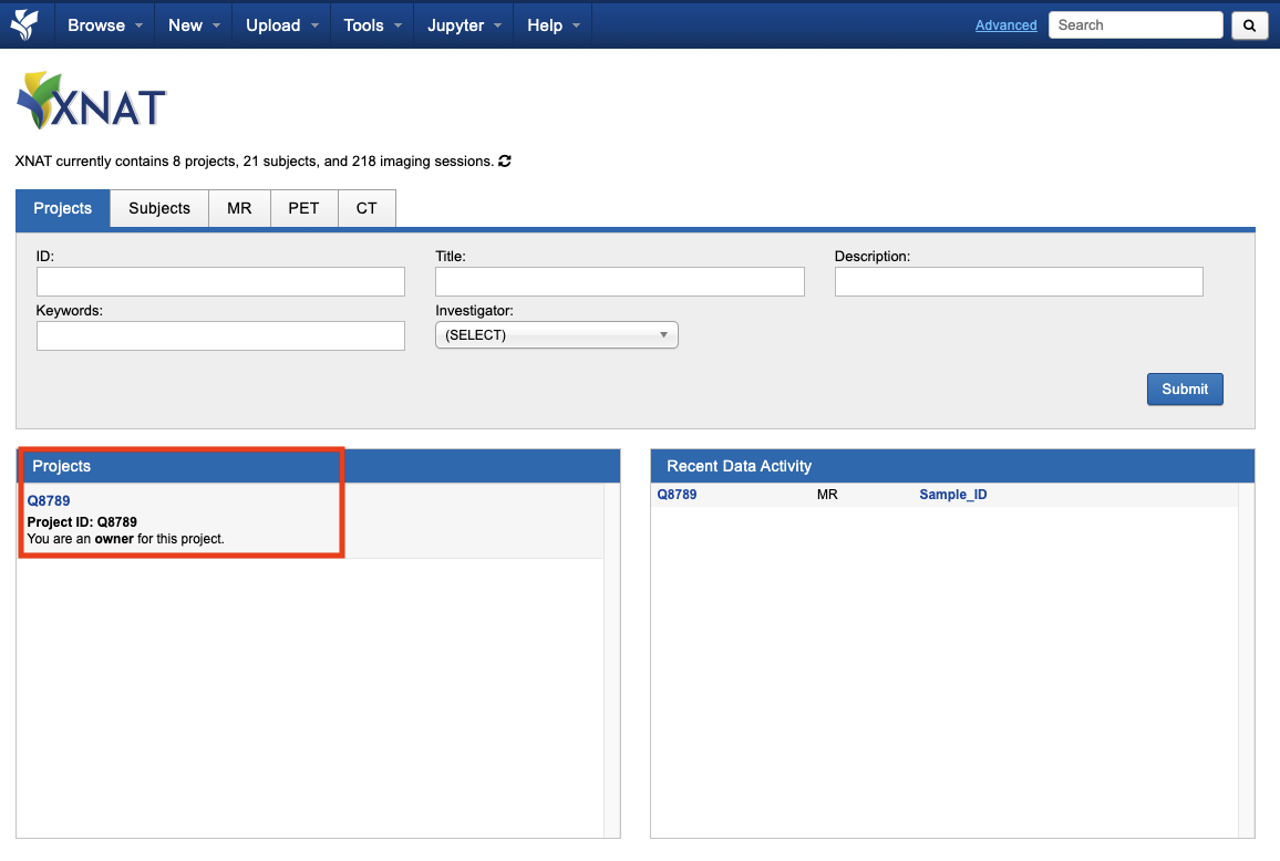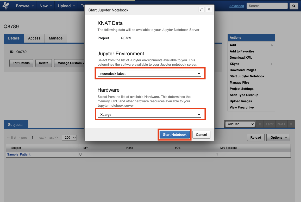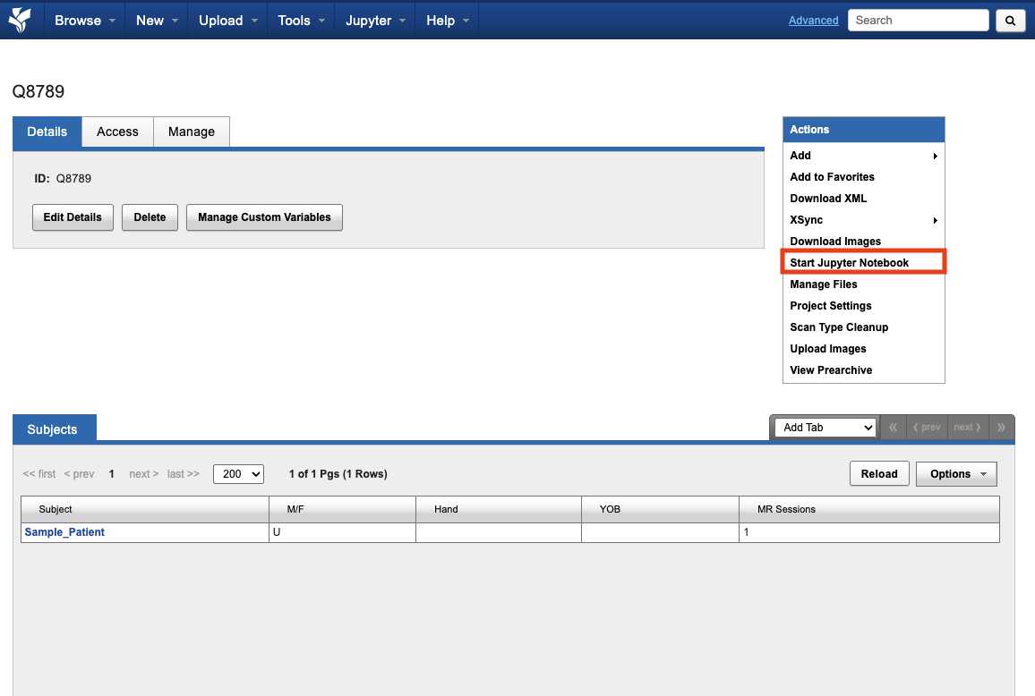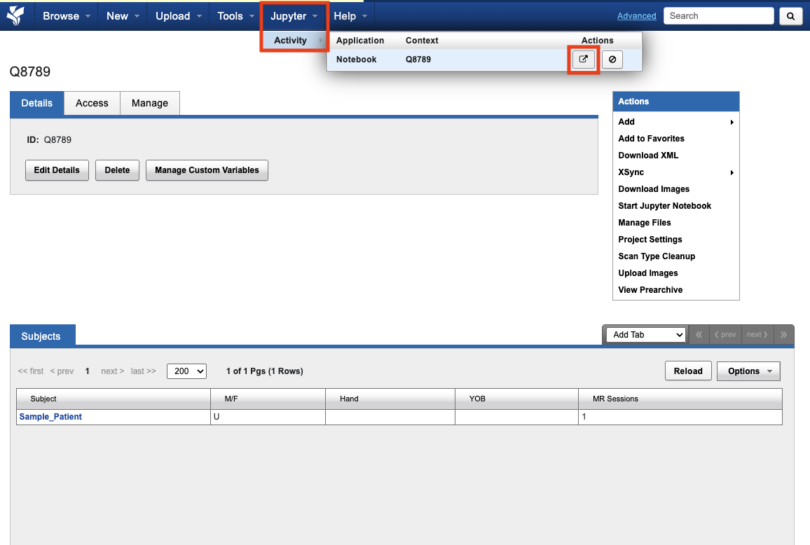 You can access a Jupyter environment directly from XNAT. This allows you to run analysis on your data using familiar tools like Jupyter notebooks.